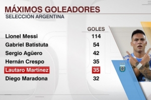 24直播网10月15日讯 劳塔罗在阿根廷队大胜波多黎各的友谊赛中梅开二度,根据ESPN统计,劳塔罗阿根廷队进球数追平克雷斯波,并列队史第四。