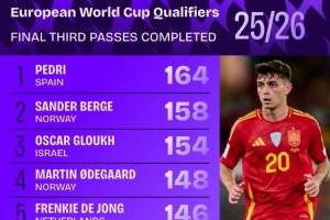 24直播网10月15日讯 Squawka列出了欧洲世预赛进攻三区成功传球排名,西班牙中场佩德里居首。