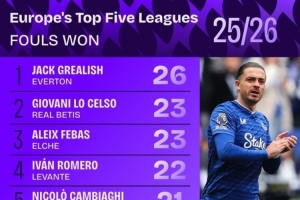 24直播网10月17日讯 25/26赛季欧洲五大联赛中被犯规次数排名出炉,来自埃弗顿的格拉利什以26次位居第一。