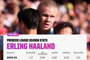 24直播网10月17日讯 据Opta统计,哈兰德本赛季每90分钟射门、进球等数据创造英超生涯新高。