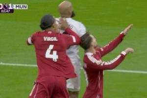 24直播网10月19日讯 英超第8轮利物浦vs曼联,曼联先进一球,第1分钟姆伯莫破门。进球前的争顶,范迪克争顶中肘击麦卡利斯特!