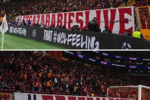 24直播网10月3日讯 《巴黎人报》报道,在加拉塔萨雷1-0战胜利物浦的欧冠比赛中,加拉塔萨雷球迷拉出许多横幅,声援巴勒斯坦民众。