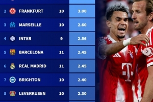 24直播网10月21日讯 德转盘点了本赛季五大联赛球队目前场均进球最多榜单(各项赛事),其中拜仁高居榜首,具体如下: