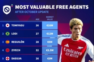 24直播网10月21日讯 德转更新自由球员身价排行榜,富安健洋1600万欧居首,雷吉隆、齐耶赫、帕科位居前十位。