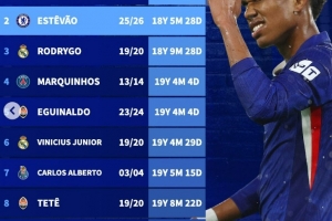 24直播网10月23日讯 在本轮欧冠切尔西5-1大胜阿贾克斯的比赛中,埃斯特旺破门。德转也盘点了欧冠改制以来巴西最年轻进球球员榜单,具体如下: