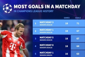 24直播网10月23日讯 德国转会市场统计了欧冠单轮比赛进球数量,并列出欧冠历史单一轮次进球排名,本轮欧冠打进71球居首。