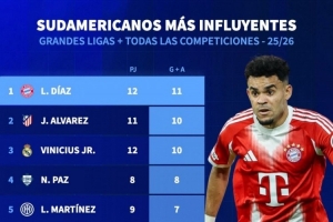 24直播网10月24日讯 德国转会市场统计了本赛季五大联赛南美球员的参与进球数量,并列出榜单,路易斯-迪亚斯参与11球居首,阿尔瓦雷斯、维尼修斯参与10球次席。