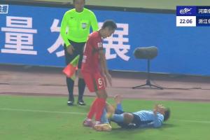 24直播网10月25日讯 河南vs浙江第23分钟,张瑷晖倒地夹住皮球,王上源上去对着皮球一通踢。