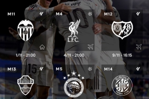 24直播网10月30日讯 11月即将到来,皇马官方晒出了球队赛程。除了11月1日主场迎战瓦伦西亚外,西甲豪门将迎来5连客,其中包括前往安菲尔德挑战利物浦。