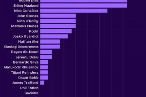 24直播网10月31日讯 数据机构squakwa统计了本赛季曼城队内的英超成功争顶情况,哈兰德和鲁本-迪亚斯并列最多。