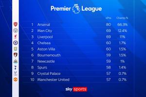 24直播网10月31日讯 天空体育引用Opta最新的数据分析指出,根据目前走势,阿森纳本赛季可能只需要70分即可夺得英超冠军。