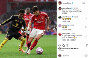 24直播网11月2日讯 英超第10轮比赛,内科-威廉姆斯踢满全场,帮助诺丁汉森林主场2-2战平曼联。