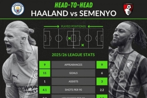 24直播网11月3日讯 本轮英超,曼城将主场对阵伯恩茅斯。赛前WhoScored列出了两队主要得分手哈兰德和塞梅尼奥的数据对比。