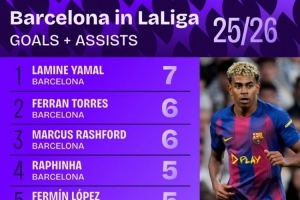 24直播网11月3日讯 据Squawka统计,巴萨本赛季5名球员联赛参与进球5+,五大联赛首队。