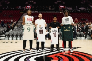 24直播网11月4日讯 美职联波特兰伐木工队球员大卫-达-科斯塔、维尔德在美职联季后赛间隙到主场支持开拓者。球队也由格兰特、西索科做代表送出了定制球衣。