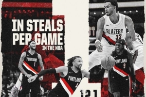 24直播网11月5日讯 开拓者官方发布数据海报,球队场均送出12.1次抢断,排名联盟第一。