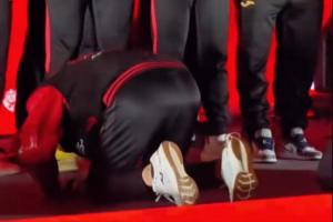 24直播网11月10日讯 今日重庆铜梁龙进行了冲超庆典,在晚会上,赛季中途接手球队的主帅张外龙感谢了球员们的努力,并向队员们行大礼致谢。