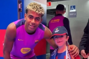 24直播网11月11日讯 巴萨上周五在诺坎普进行了公开训练,阿劳霍带着一位患病小球迷见亚马尔。