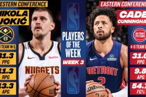 24直播网11月11日讯 今日NBA官方宣布,活塞球星康宁汉姆和掘金球星约基奇当选本赛季第3周东、西部最佳球员。