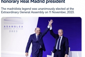 24直播网11月11日讯 皇马官网消息,2023年11月11日,何塞-马丁内斯-皮里在皇家马德里城篮球馆举行的特别全体大会上,被一致推选为俱乐部的荣誉主席。这一任命至今已有两年。