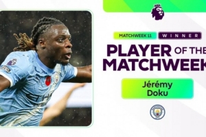 24直播网11月11日讯 英超官方消息,经投票曼城边锋多库当选本轮最佳球员。