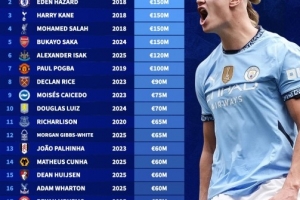24直播网11月12日讯 德国转会市场盘点了英超各队历史身价最高球员,哈兰德以2亿欧居首,阿扎尔、凯恩、萨拉赫和萨卡均为1.5亿欧。
