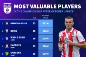 24直播网10月6日讯 德转更新英冠球员身价,在目前的英冠球员身价中,南安普顿球员贝利斯和伊镇球员戴维斯2200万欧并列第一。