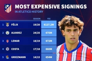 24直播网11月12日讯 阿波罗体育资本斥资13亿欧元收购马竞俱乐部55%股份,并承诺未来几年再投资约13亿欧元,德国转会市场统计了马竞队史引援的费用,并列出最贵引援排名。