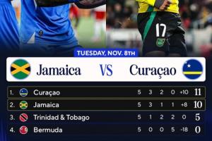 24直播网11月14日讯 北美预选第三阶段第5轮, 库拉索客场7-0狂胜百慕大群岛,牙买加客场1-1遭特立尼达和多巴哥绝平。