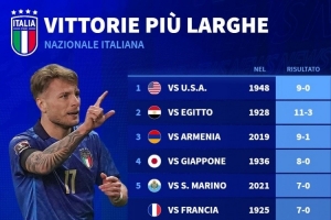 24直播网11月14日讯 北京时间11月17日凌晨,意大利将在世预赛最后一轮比赛中主场对阵挪威,意大利此役需要至少净胜挪威9球,才能直接出线。德国转会市场列出了意大利队史最大比分胜利榜单。