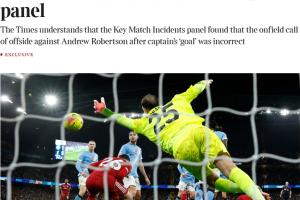 24直播网11月14日讯 英媒《泰晤士报》报道,英超专家组已经裁定,上轮英超范戴克对曼城的进球应被判有效。