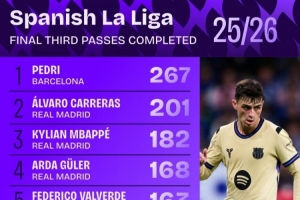 24直播网10月7日讯 日前,Squawka统计了本赛季西甲进攻三区传球次数排行,佩德里267次居首,5名皇马球员进前十。