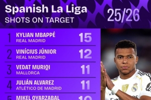 24直播网10月7日讯 日前,Squawka统计了本赛季西甲射正次数排行,姆巴佩15次居首。