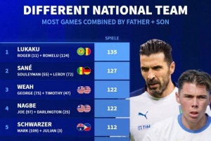 24直播网11月20日讯 德国转会市场统计了足坛父子代表不同国家队的出场次数,并列出榜单,布冯儿子路易斯·布冯一周之内在捷克U19青年队两次戴帽,有望入选捷克成年队,因此德转也提前将布冯父子列入榜单。