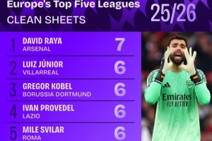 24直播网11月21日讯 五大联赛战火即将重燃,数据机构squakwa也统计了本赛季五大联赛门将零封场次榜,枪手门将拉亚居首。