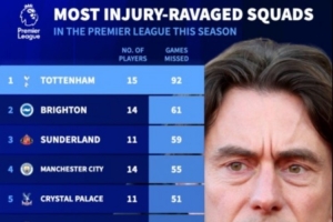 24直播网11月25日讯 德转列本赛季英超球队伤病榜,热刺15名球员受伤,共计缺席92场比赛排名第一,布莱顿、桑德兰位列二三位。