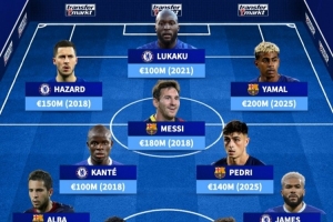 24直播网11月26日讯 北京时间今晚凌晨4点,欧冠联赛阶段第5轮,切尔西主场迎战巴萨。赛前,德转评出这两支球队历史最贵11人阵容,其中梅西、亚马尔领衔锋线,阿扎尔、卢卡库在列。这套阵容的总身价达12.5亿欧元。