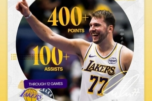 24直播网11月26日讯 湖人当家球星卢卡·东契奇本赛季出战12场已达成400分100助,成为NBA历史首人。