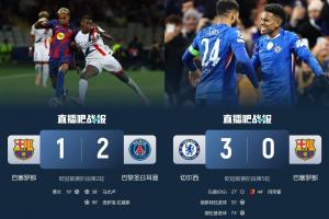 24直播网11月26日讯 今日凌晨的欧冠,巴萨0-3不敌切尔西,欧冠战绩来到2胜1平2负。