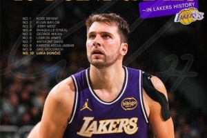 这是东契奇湖人生涯第7次40+,超越魔术师升至队史第十,赛后湖人发布东契奇40+队史前十海报。