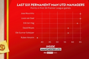 24直播网10月9日讯 加盟曼联以来,阿莫林已经率队踢了34场英超比赛,但他的执教表现远远没能达到外界的期望。根据天空体育的数据统计,阿莫林前34场英超比赛仅仅拿到37分,低于之前数位曼联主帅所拿到的积分。