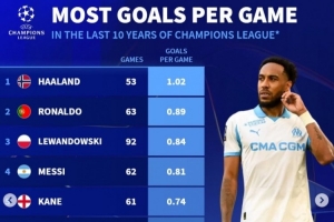 24直播网11月26日讯 马赛在本轮欧冠2-1逆转纽卡斯尔,奥巴梅扬梅开二度。《转会市场》统计显示,他也是近10年欧冠场均进球榜前十。