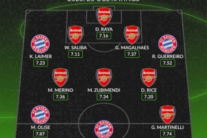 24直播网11月27日讯 拜仁将在本轮欧冠客战阿森纳,whoscored也列出了两队本赛季欧冠评分合体最佳阵,阿森纳7将在列。