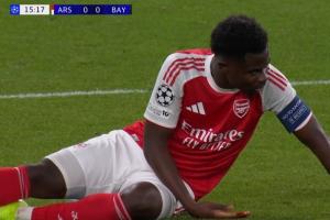 24直播网11月27日讯 阿森纳vs拜仁第16分钟,诺伊尔出击解围,萨卡鼻子被撞出血,队医进场处理!