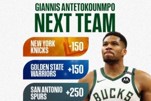 24直播网10月9日讯 根据BetUS NBA的数据显示,字母哥下家最大热门就是尼克斯,而勇士、马刺等队也都被认为是他的潜在热门下家。