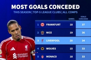 24直播网11月27日讯 德国转会市场统计了本赛季五大联赛球队的失球数量,并列出榜单,法兰克福丢37球最多,利物浦丢34球第三。