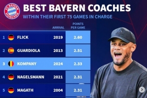 24直播网11月27日讯 拜仁在本轮欧冠焦点战客场1-3不敌阿森纳,遭遇赛季首败。《转会市场》统计显示,孔帕尼同期执教数据依然位列拜仁队史前茅。