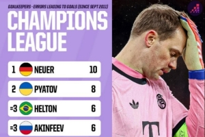 24直播网11月27日讯 在本轮欧冠,阿森纳3-1击败拜仁,诺伊尔出击失误导致丢球。数据网站OPTA也盘点了自2011年9月以来欧冠赛场门将因失误导致丢球榜单,具体如下: