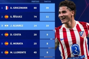 24直播网11月27日讯 在本轮欧冠马竞2-1击败国米的比赛中,阿尔瓦雷斯破门,打进马竞生涯欧冠第10球。以下为马竞队史欧冠进球榜: