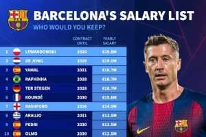 24直播网10月10日讯 德国转会市场列出了巴萨球员年薪排名,莱万2080万欧居首,德容1900万欧次席。